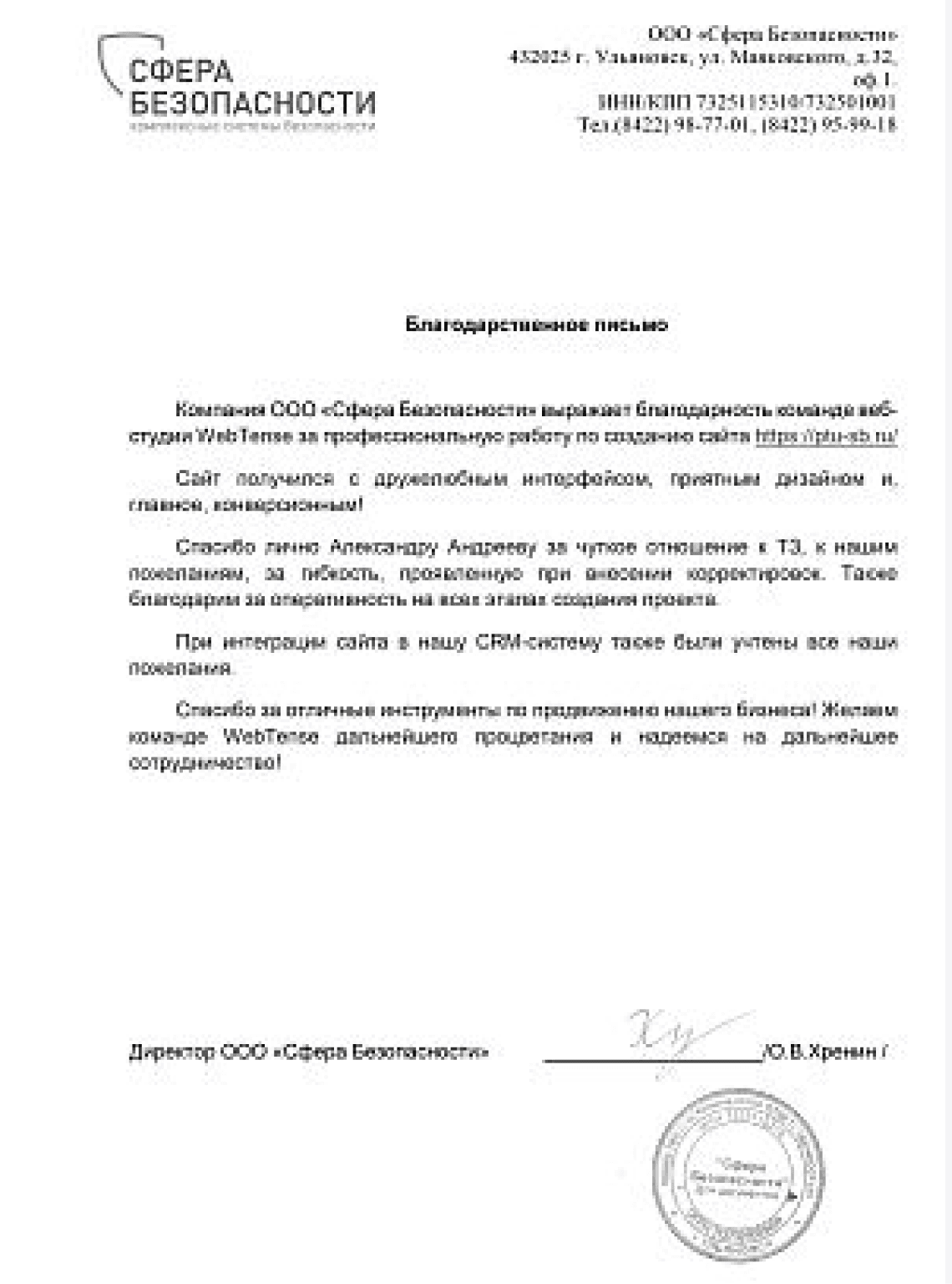 Компания ООО «Сфера Безопасности» выражает благодарность